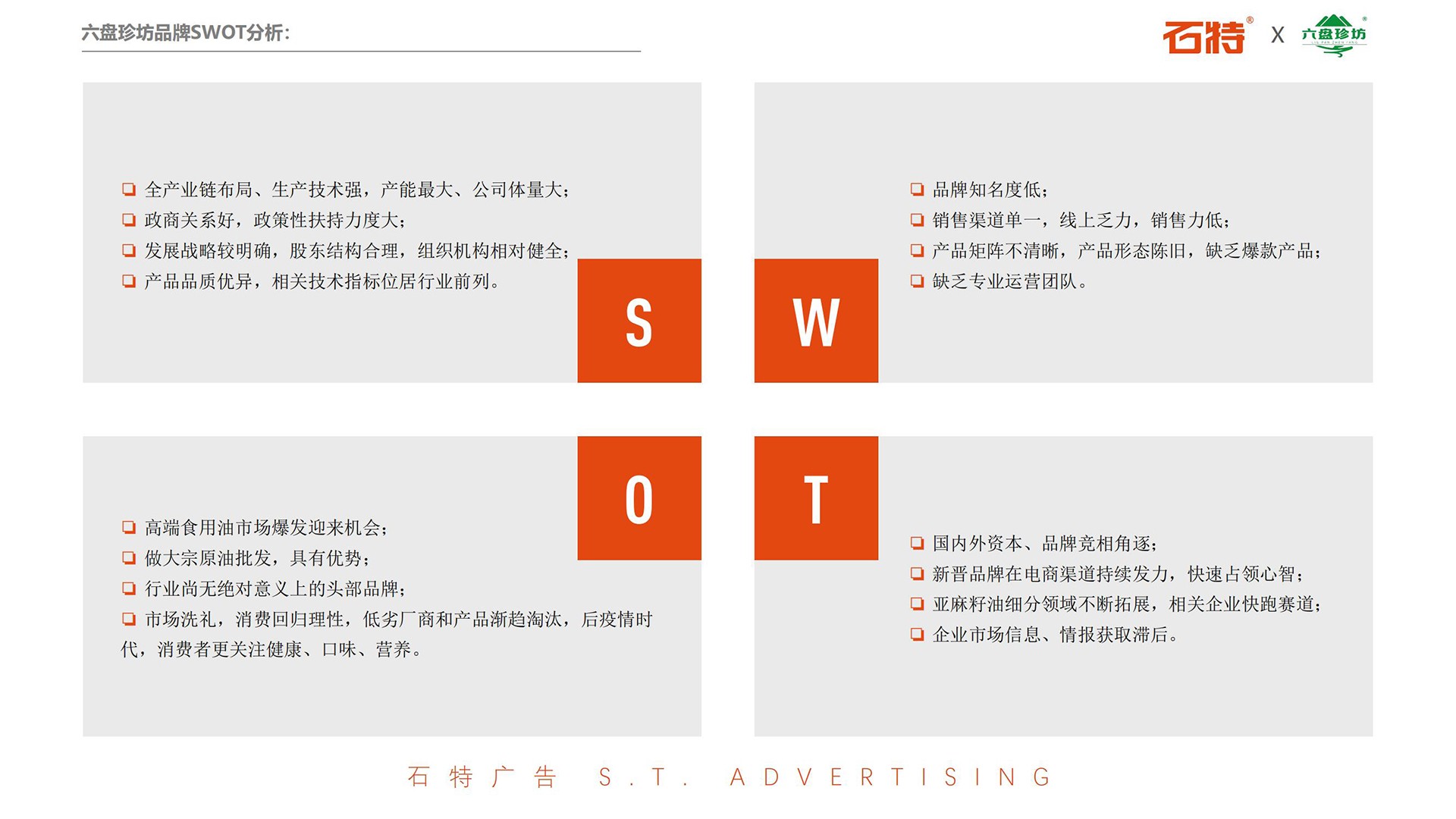 石特廣告在進行實地考察時,走訪了亞麻花的種植地、生產(chǎn)廠區(qū)、辦公區(qū)域,并查閱了相關(guān)資料,分析得出了六盤珍坊的目標市場、品類趨勢、市場形態(tài)和競爭環(huán)境,并結(jié)合對品牌的SWOT分析,梳理并聚焦了企業(yè)目前存在的問題。