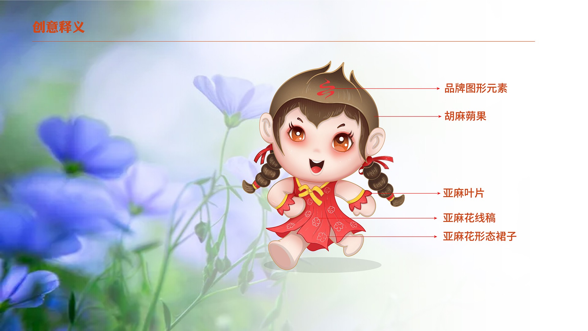 4、產(chǎn)品屬性:亞麻籽油是亞麻花的提取物,在女娃的設(shè)計上綠色手繩為亞麻花葉,衣裙為紫是亞麻花的顏色,裙子上的斑點是亞麻花,裙身下擺整體也勾勒出亞麻花的形態(tài);男娃設(shè)定上,肚兜的斑點為亞麻籽。