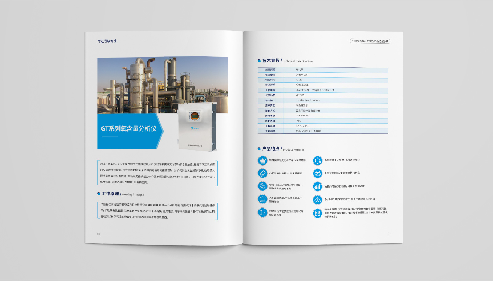 3、內頁將產品詳細展示,并針對每個產品進行細致介紹。同時,在每個產品介紹中加入工作原理、技術參數、產品特點等信息,讓客戶更全面地了解泰仲科技所提供的氣體分析解決方案及產品。