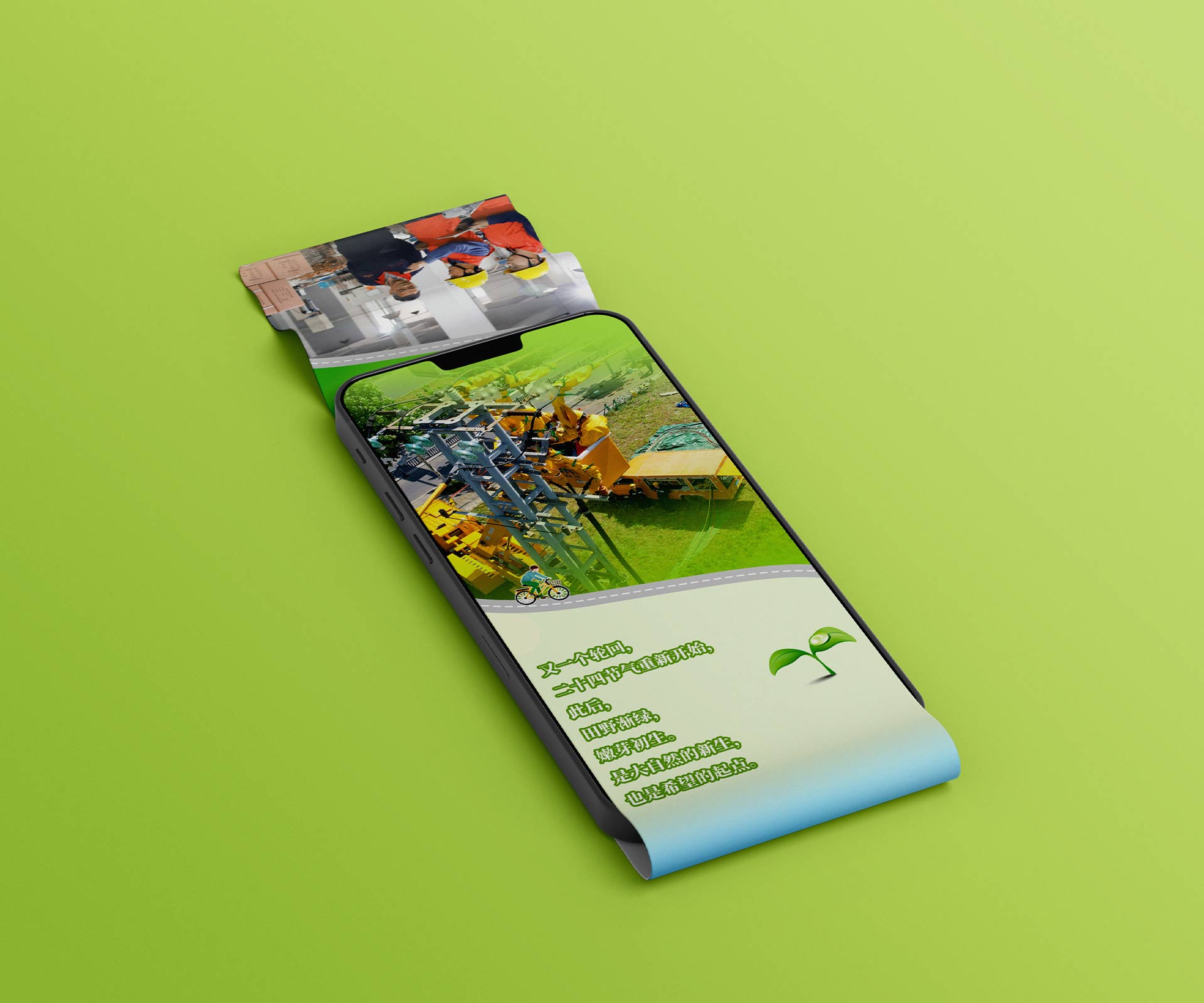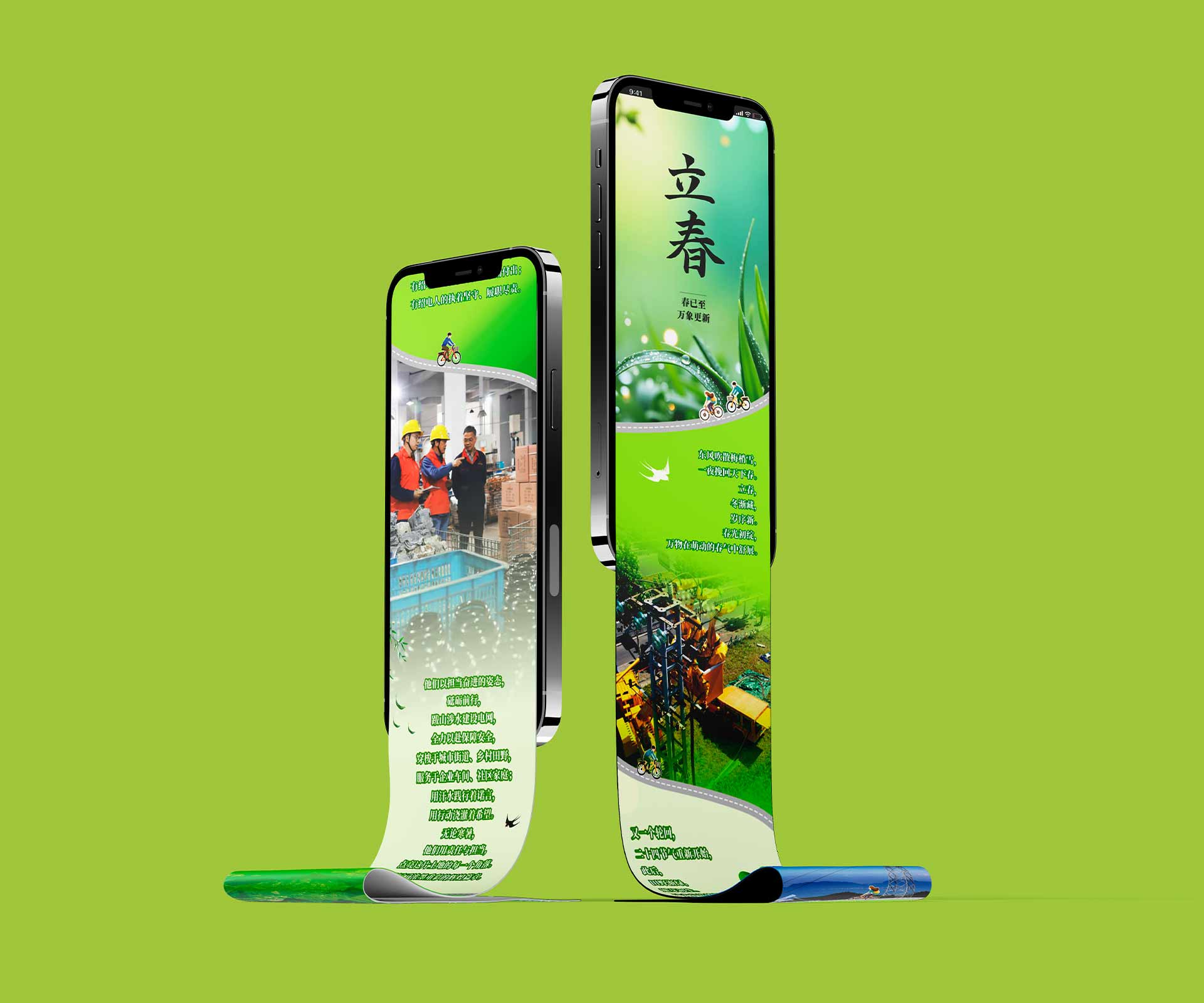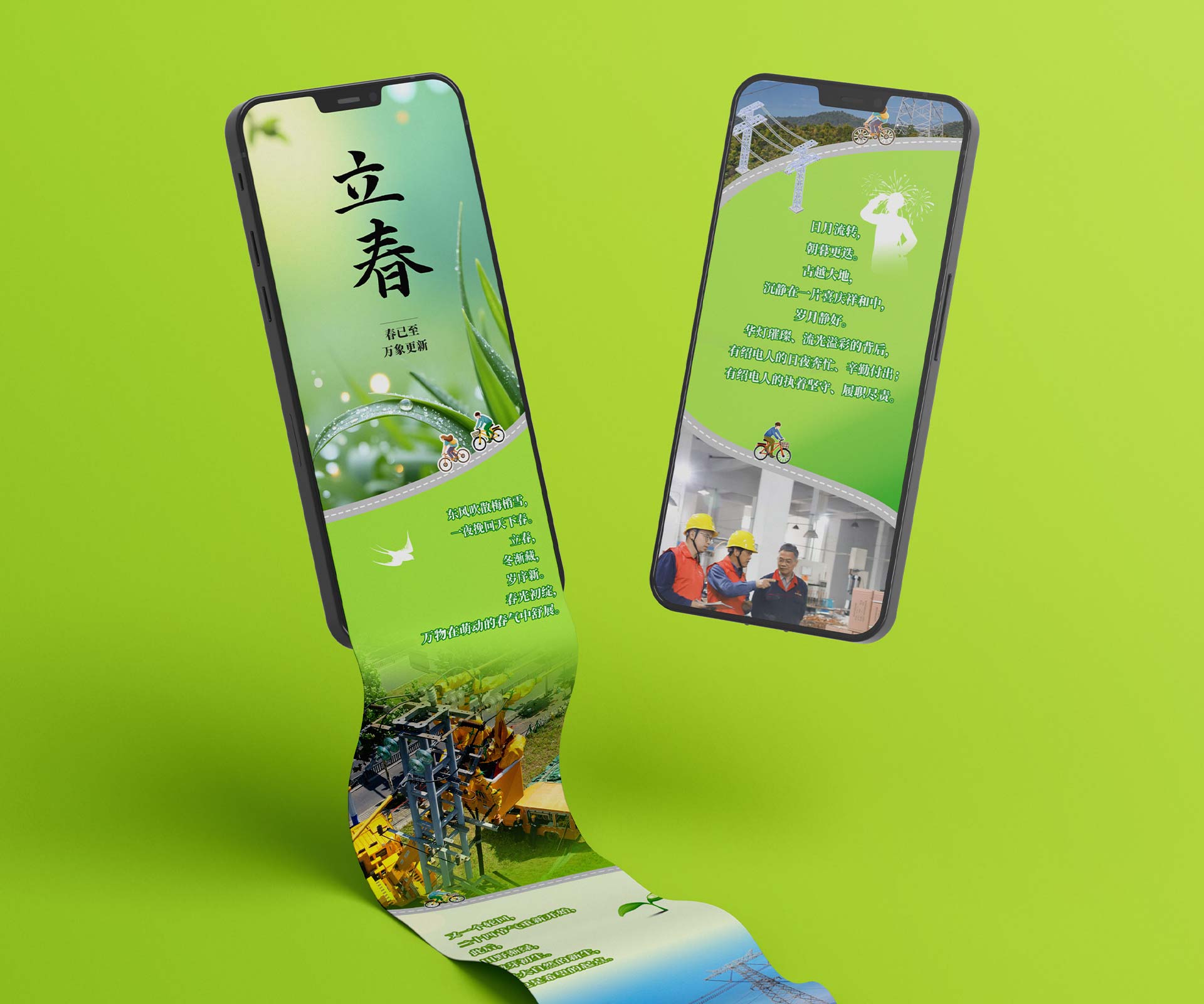 融合傳統(tǒng)與現(xiàn)代元素:設(shè)計團(tuán)隊以綠色為主色調(diào),契合立春萬物復(fù)蘇的氛圍。畫面中融入燕子、春花等經(jīng)典立春元素,同時將電力設(shè)施以藝術(shù)化的形式展現(xiàn),比如把電線桿設(shè)計成竹子的造型,寓意電力服務(wù)像竹子一樣堅韌且節(jié)節(jié)高升,實現(xiàn)傳統(tǒng)與現(xiàn)代元素的有機(jī)融合。
