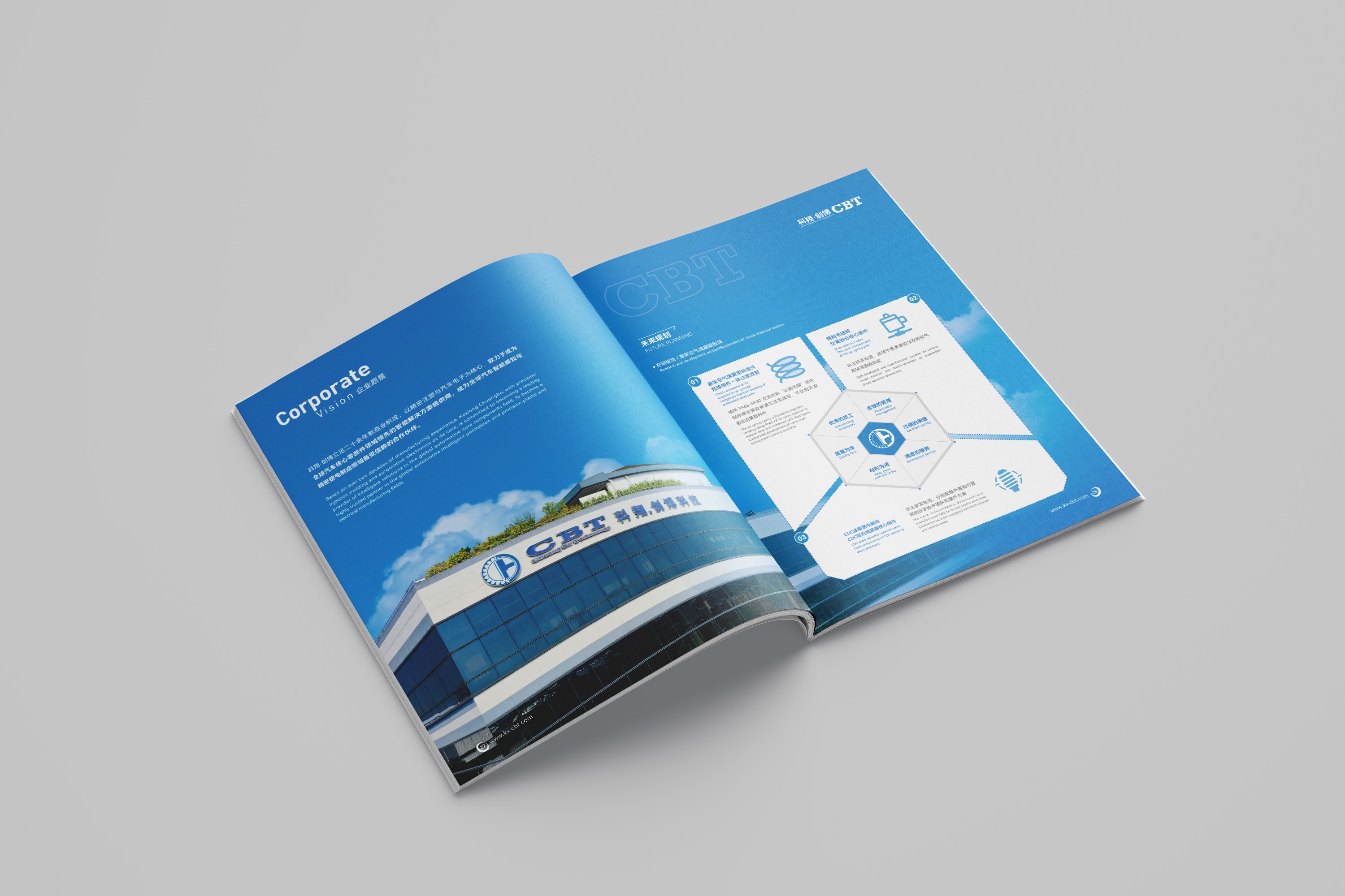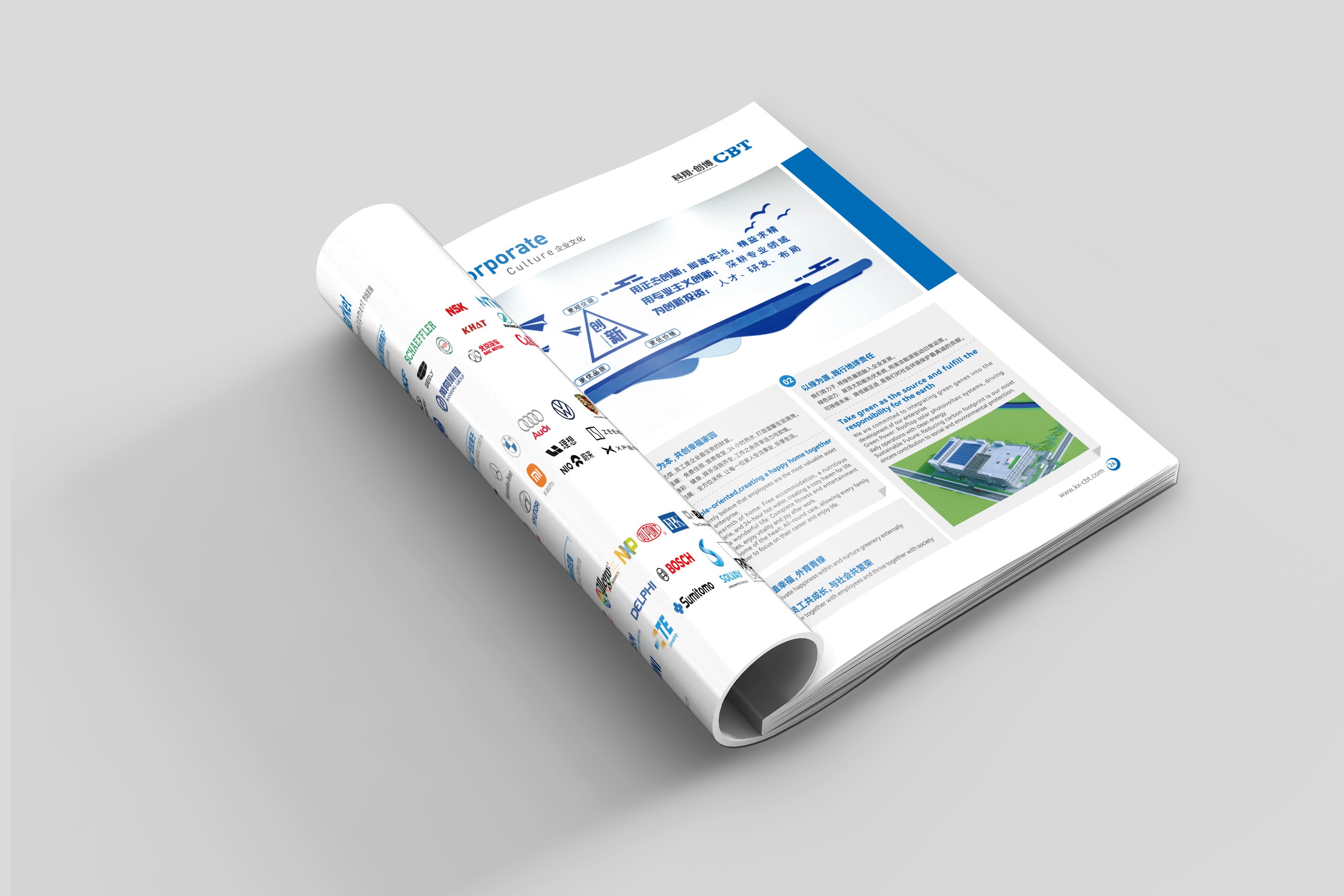 中英雙語與國際接軌: 考慮到汽車產(chǎn)業(yè)鏈的全球化特性,畫冊內(nèi)容采用中英雙語編排,設(shè)計上確保雙語排版的規(guī)范與美觀,滿足創(chuàng)博科技開拓國際業(yè)務(wù)、對接海外客戶的溝通需求。
