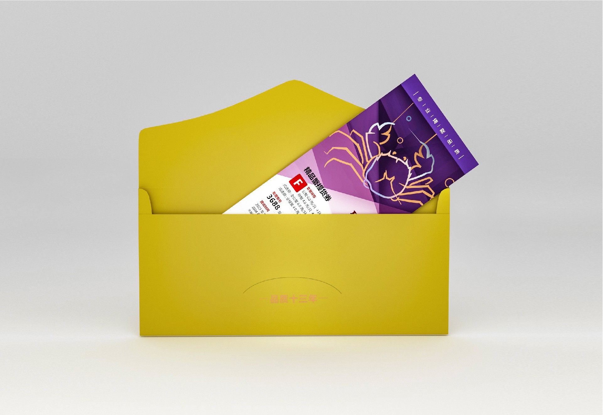 采用信封式包裝,以黃色為主色調,代表大閘蟹的鮮美。在信封的正面上部印有瑞王大閘蟹的LOGO,以突出品牌形象,并附上“品質十三年”的口號,展示企業的信譽度。
