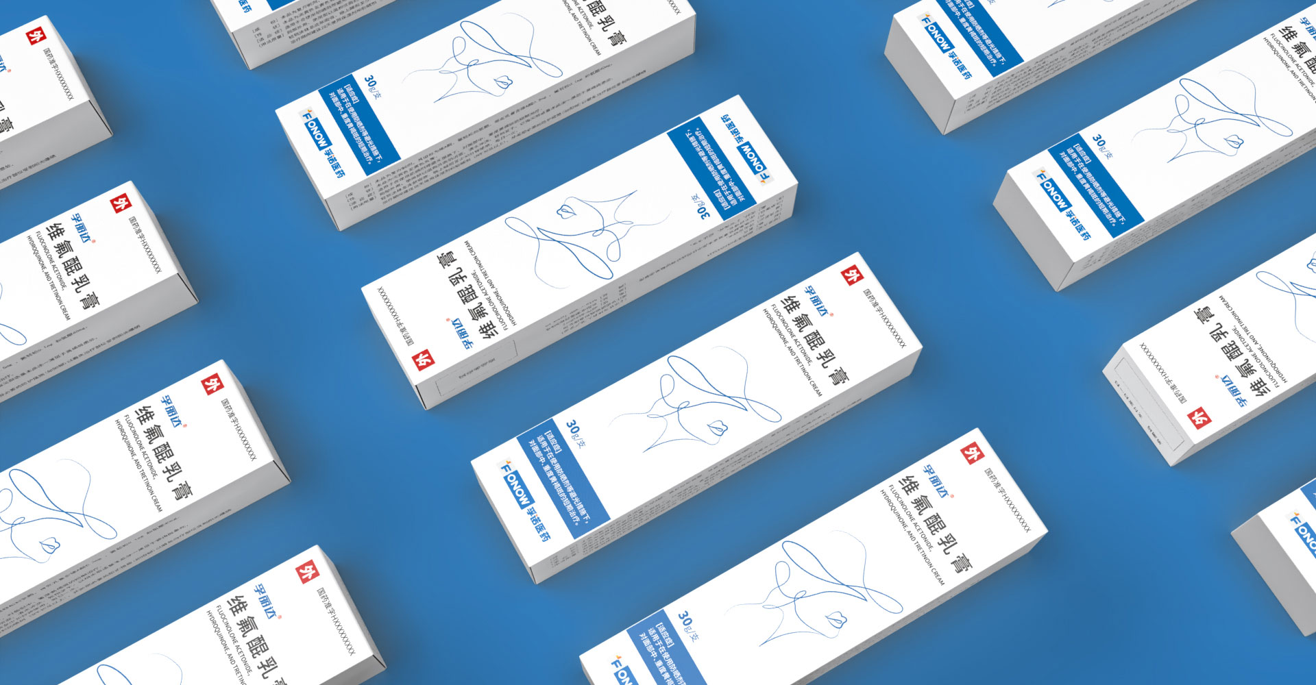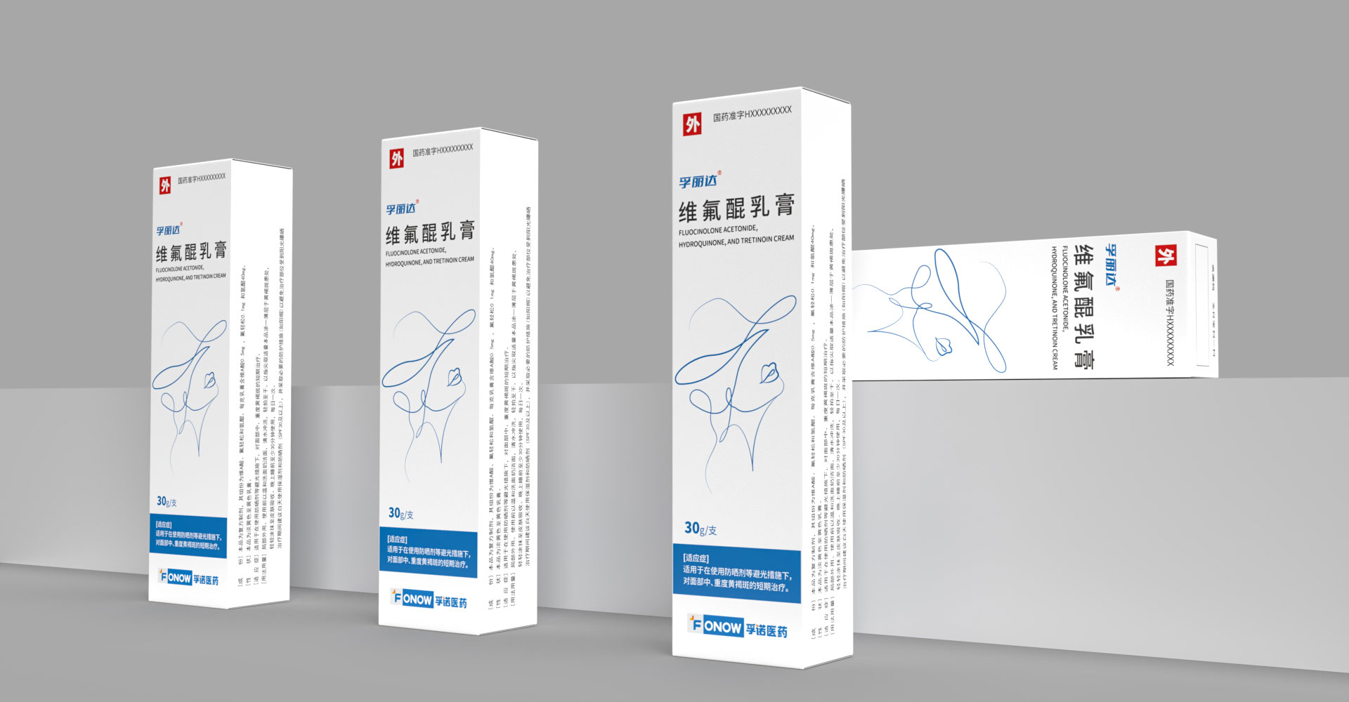 孚諾醫藥兩批次委托石特大健康進行產品包裝設計,首次設計產品上市滿意后進行了二次新款的設計;為維氟醌乳膏設計包裝:“孚康達”的首字母“F”進行創意設計,紫色、白色色塊勾勒“F”字形,增強品牌識別,紫色寓意優雅、高貴,以其為主色與產品主要治療功效變美的預期目標相符合。同款產品兩個渠道不同設計方案。