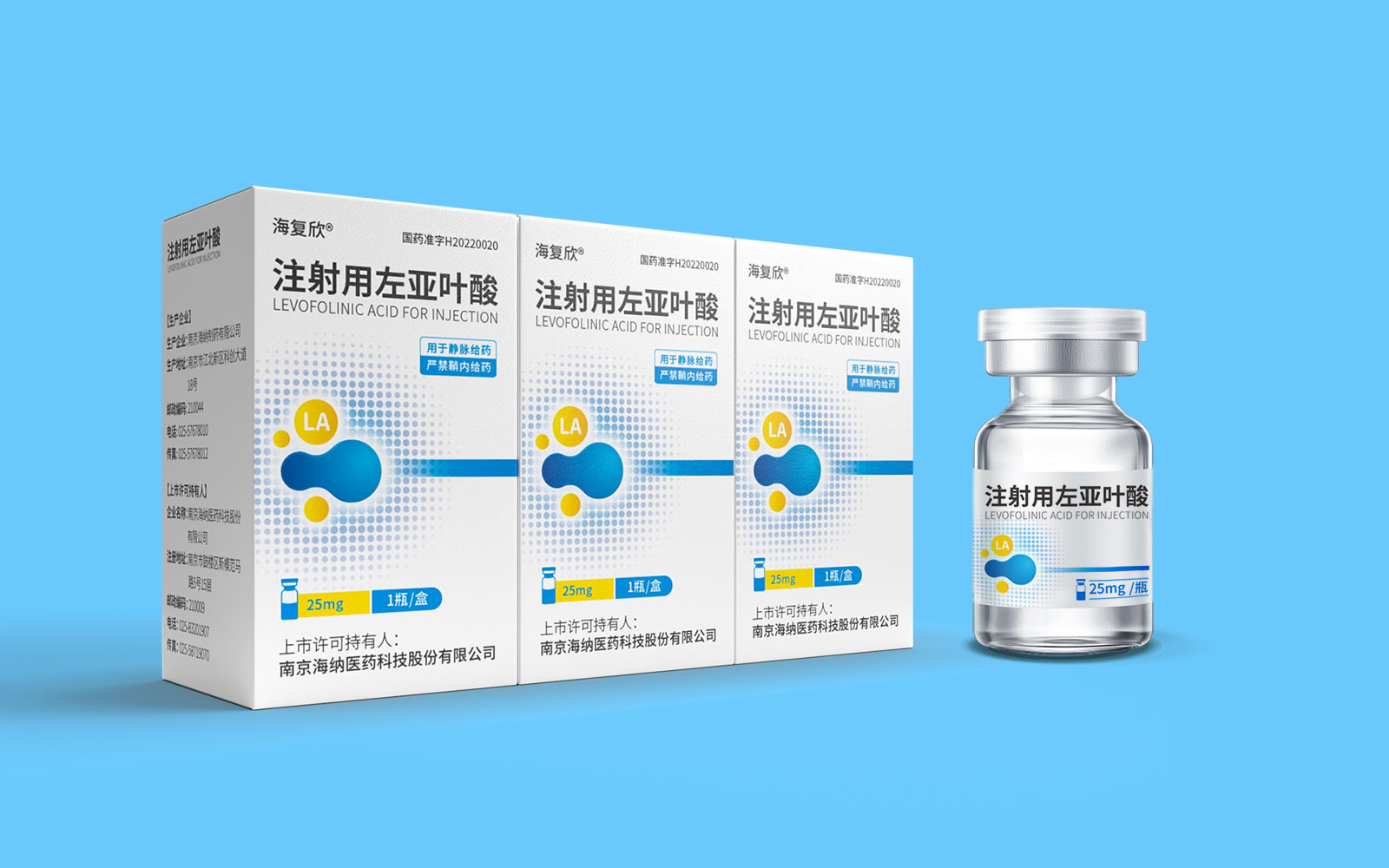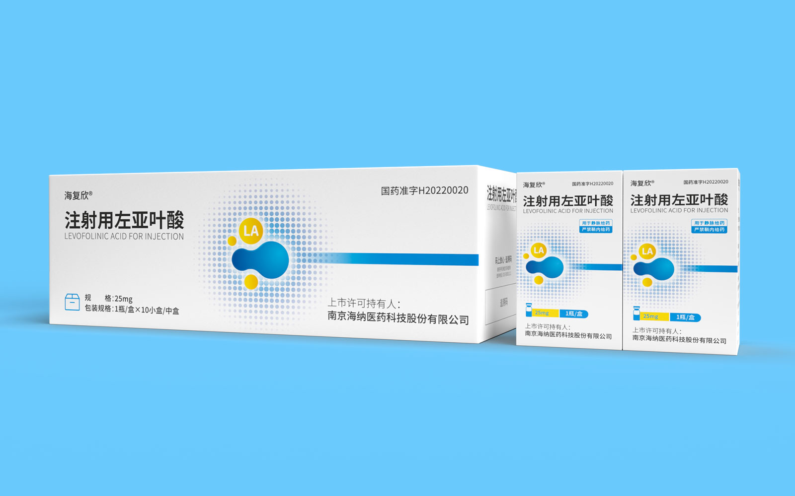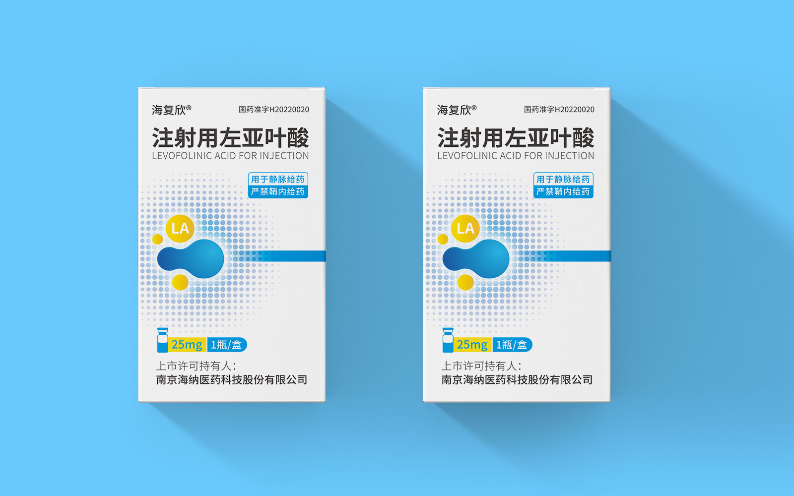 色彩運用上,藍色具有極強的醫(yī)藥行業(yè)專屬性,同時藍色安靜舒適,益于舒緩情緒,保持平靜。黃色為藥品粉末顏色,與本藥品特性相呼應,整體顏色簡約醒目。LA左亞葉酸首字母縮寫;同時體現藥品具有預防腫瘤、抑制腫瘤增殖和再生的作用的應用途徑,加強對藥品的認知與記憶。擴散波點以漸變擴散波點的形式凸顯產品快速起效的特點。