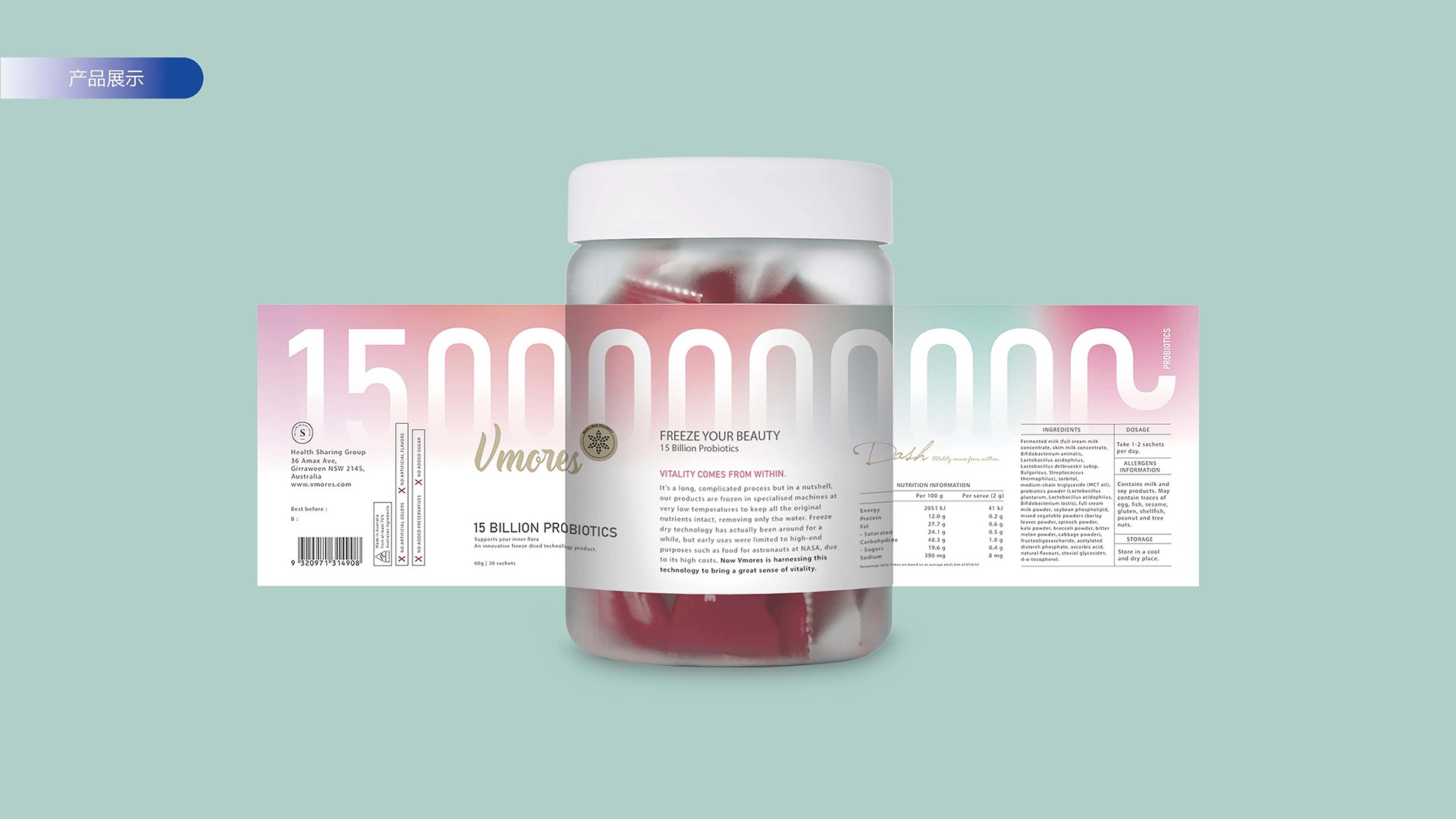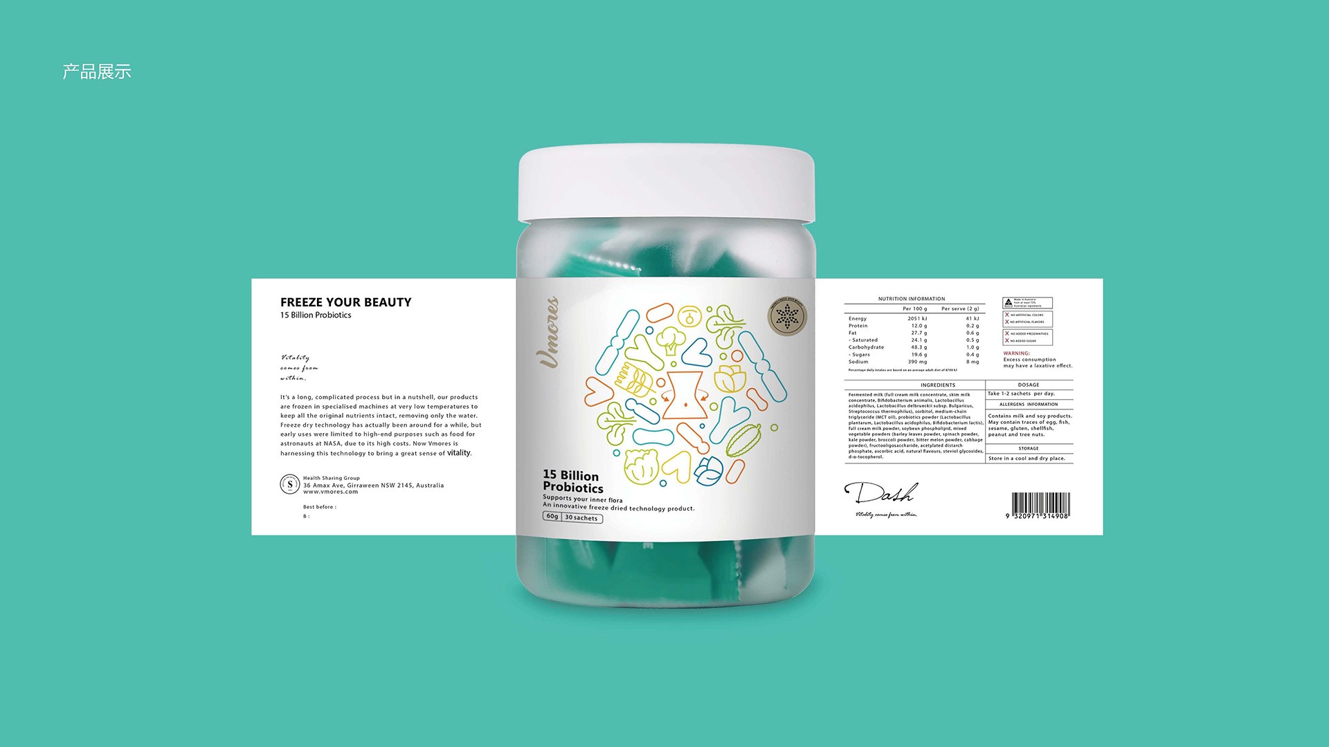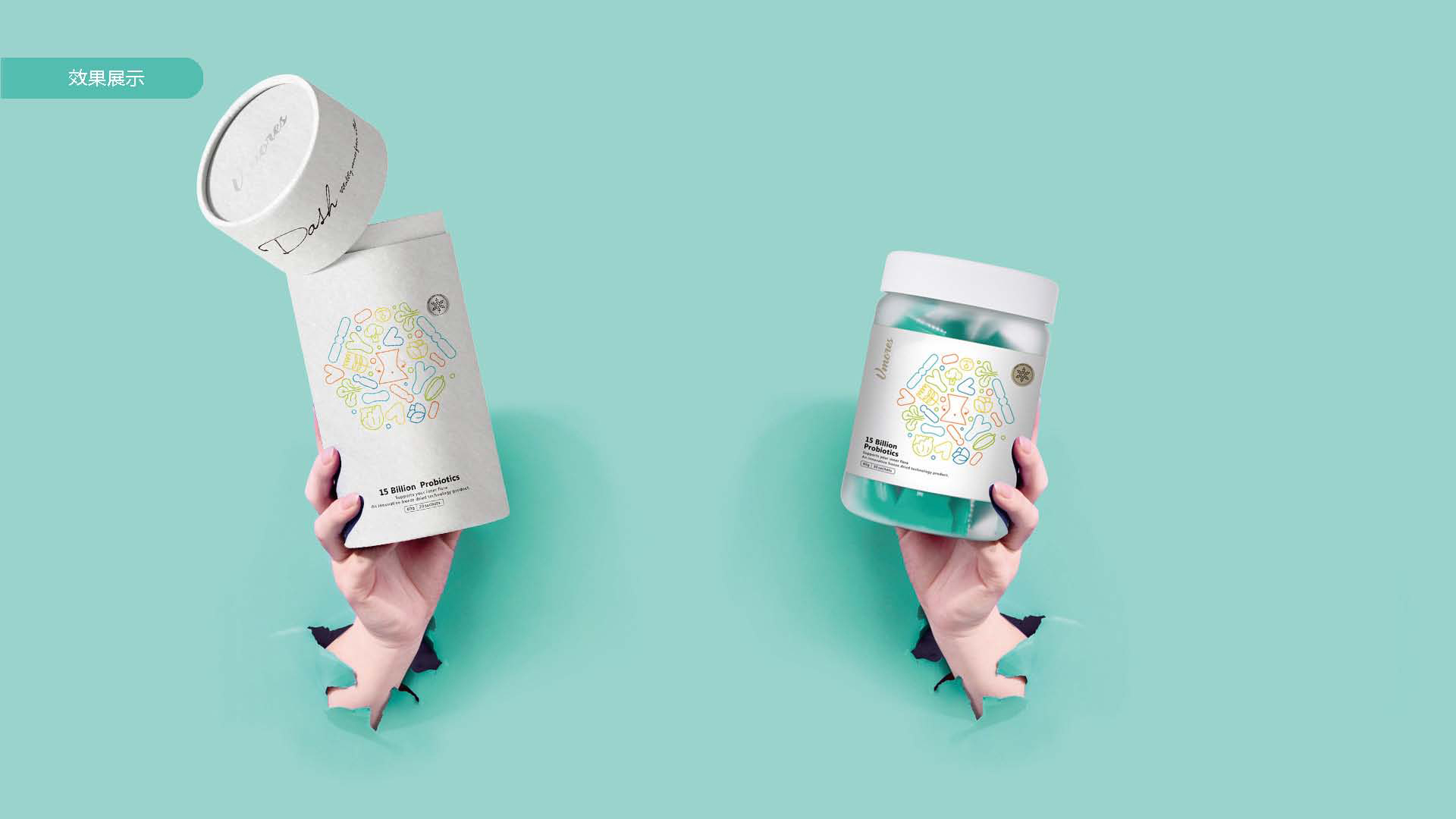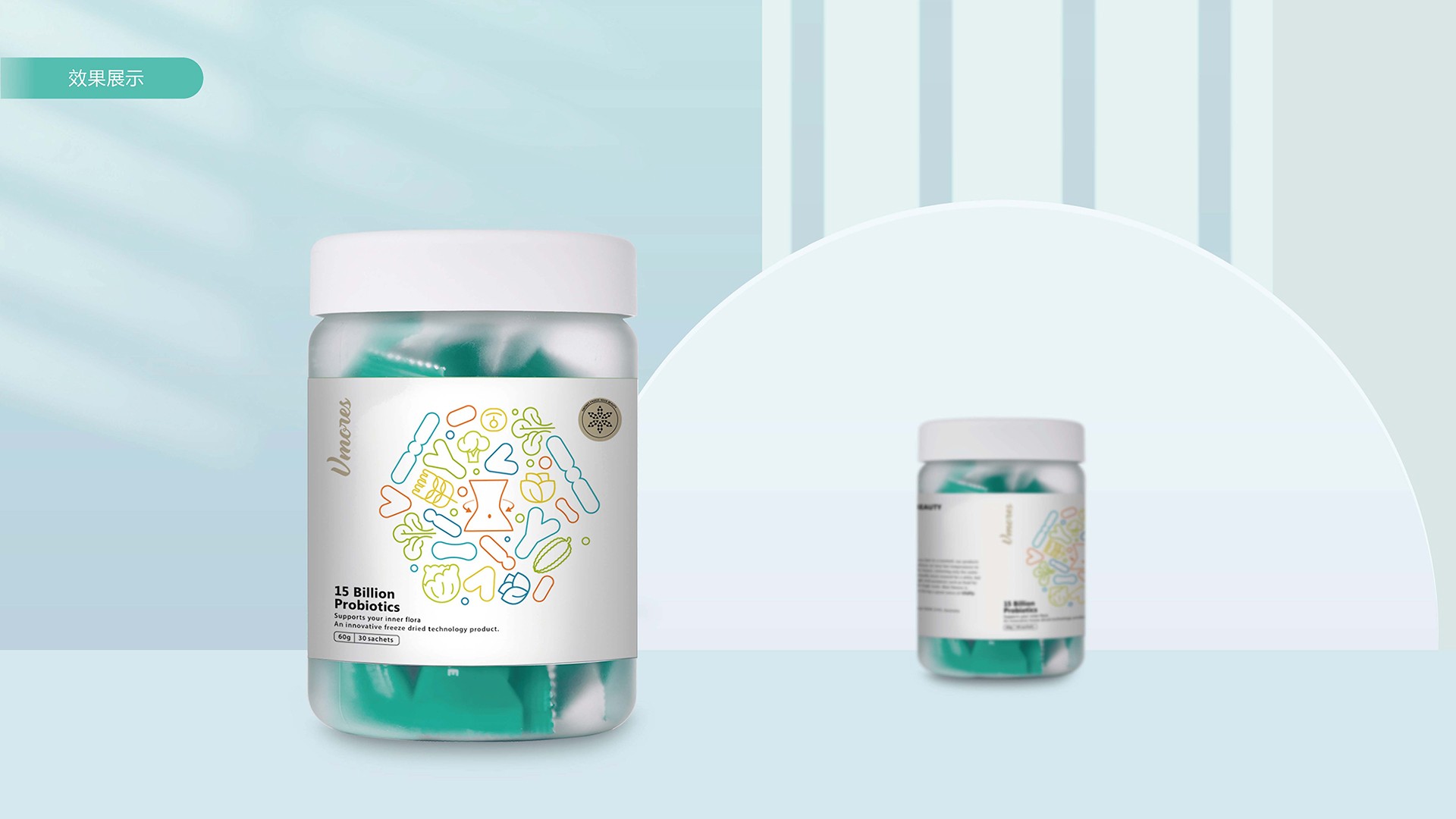 突出150億益生菌,以大額數(shù)字吸引眼球;將數(shù)字設(shè)計(jì)成腸道形狀,表現(xiàn)“瘦子菌”是腸道中的有益菌群,產(chǎn)品有益與腸道的功效;整體使用多彩的漸變色,符合產(chǎn)品調(diào)性及目標(biāo)群眾的審美。此款包裝設(shè)計(jì)將產(chǎn)品效果和成分,以抽象的形式表現(xiàn)出來,插圖中心是瘦身效果,為產(chǎn)品功效,周圍是三種有益菌群,六種超級(jí)蔬菜的組合;說明產(chǎn)品營養(yǎng)健康,配色清新活波,較為年輕化。