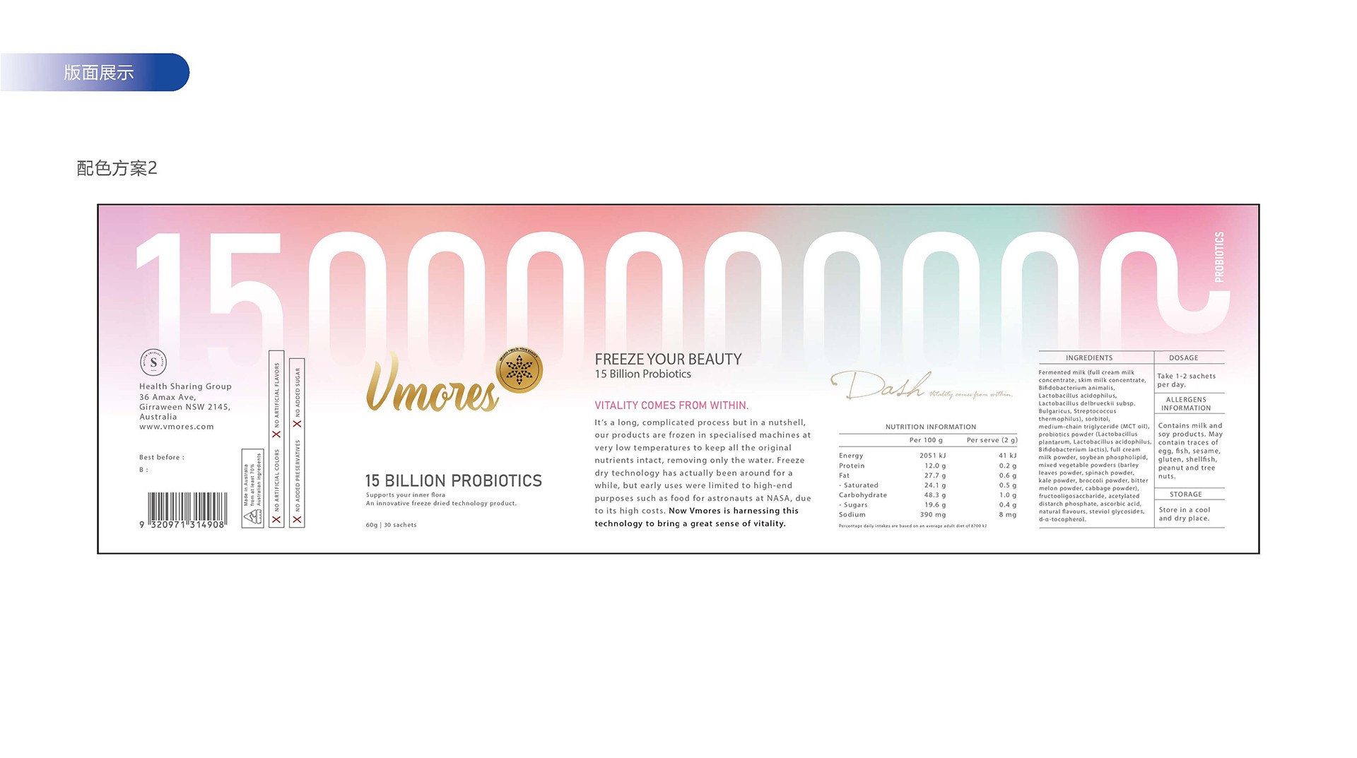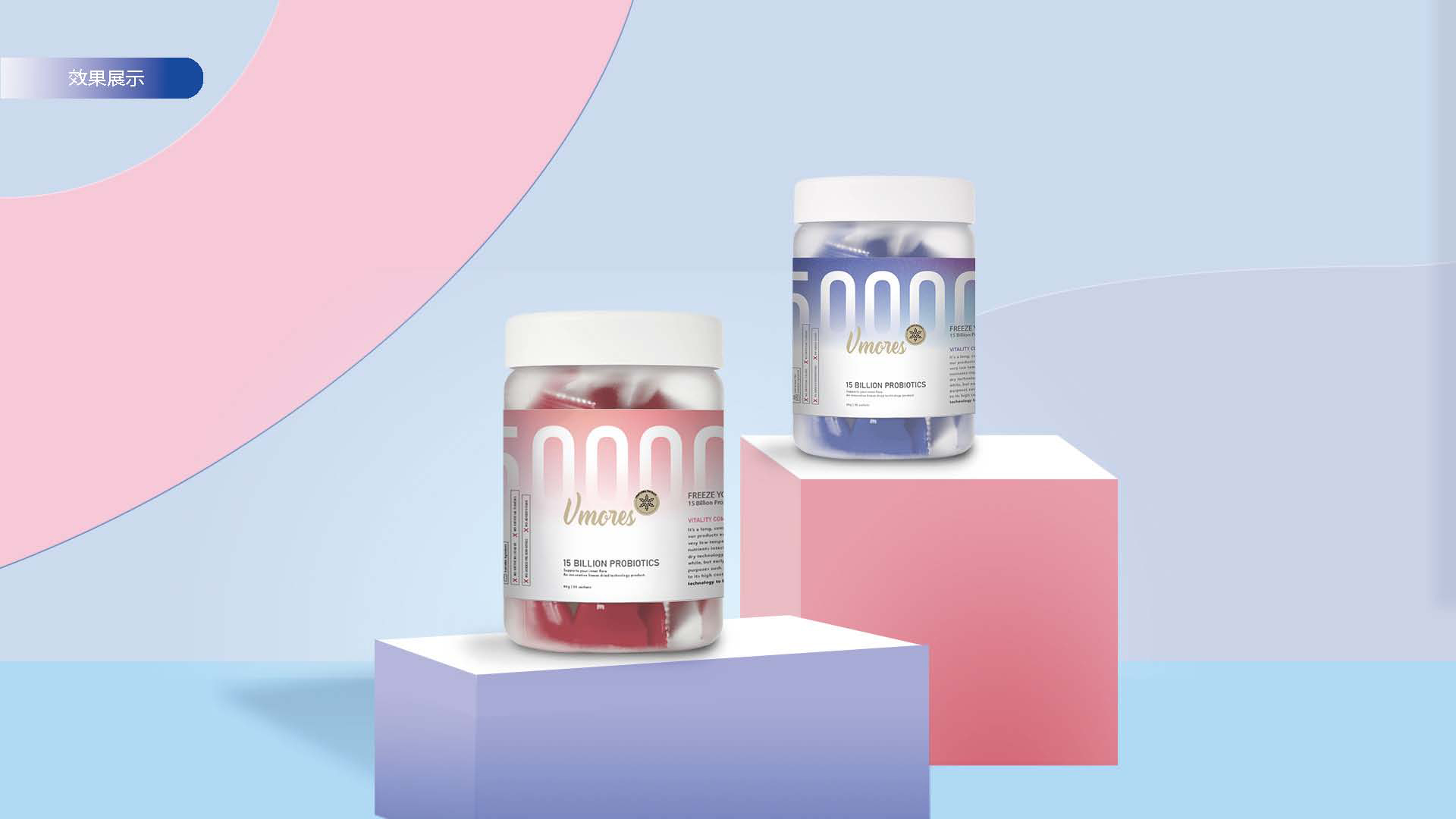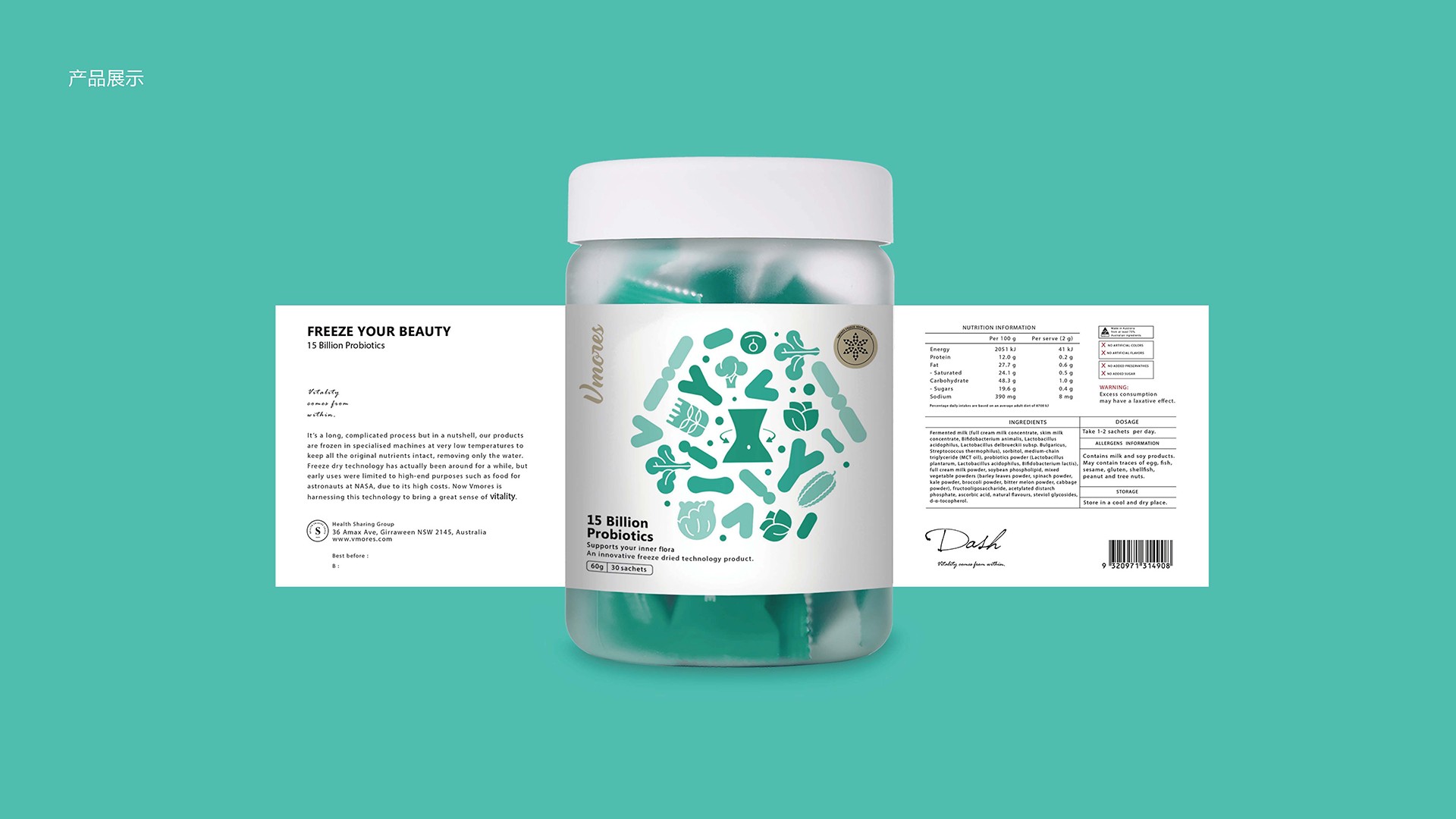 突出150億益生菌,以大額數(shù)字吸引眼球;將數(shù)字設(shè)計(jì)成腸道形狀,表現(xiàn)“瘦子菌”是腸道中的有益菌群,產(chǎn)品有益與腸道的功效;整體使用多彩的漸變色,符合產(chǎn)品調(diào)性及目標(biāo)群眾的審美。此款包裝設(shè)計(jì)將產(chǎn)品效果和成分,以抽象的形式表現(xiàn)出來,插圖中心是瘦身效果,為產(chǎn)品功效,周圍是三種有益菌群,六種超級(jí)蔬菜的組合;說明產(chǎn)品營養(yǎng)健康,配色清新活波,較為年輕化。