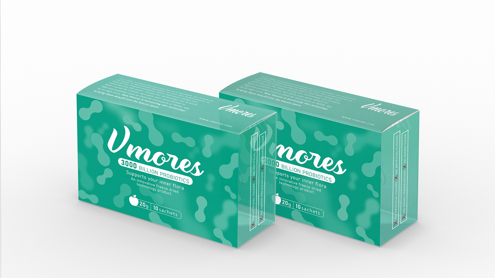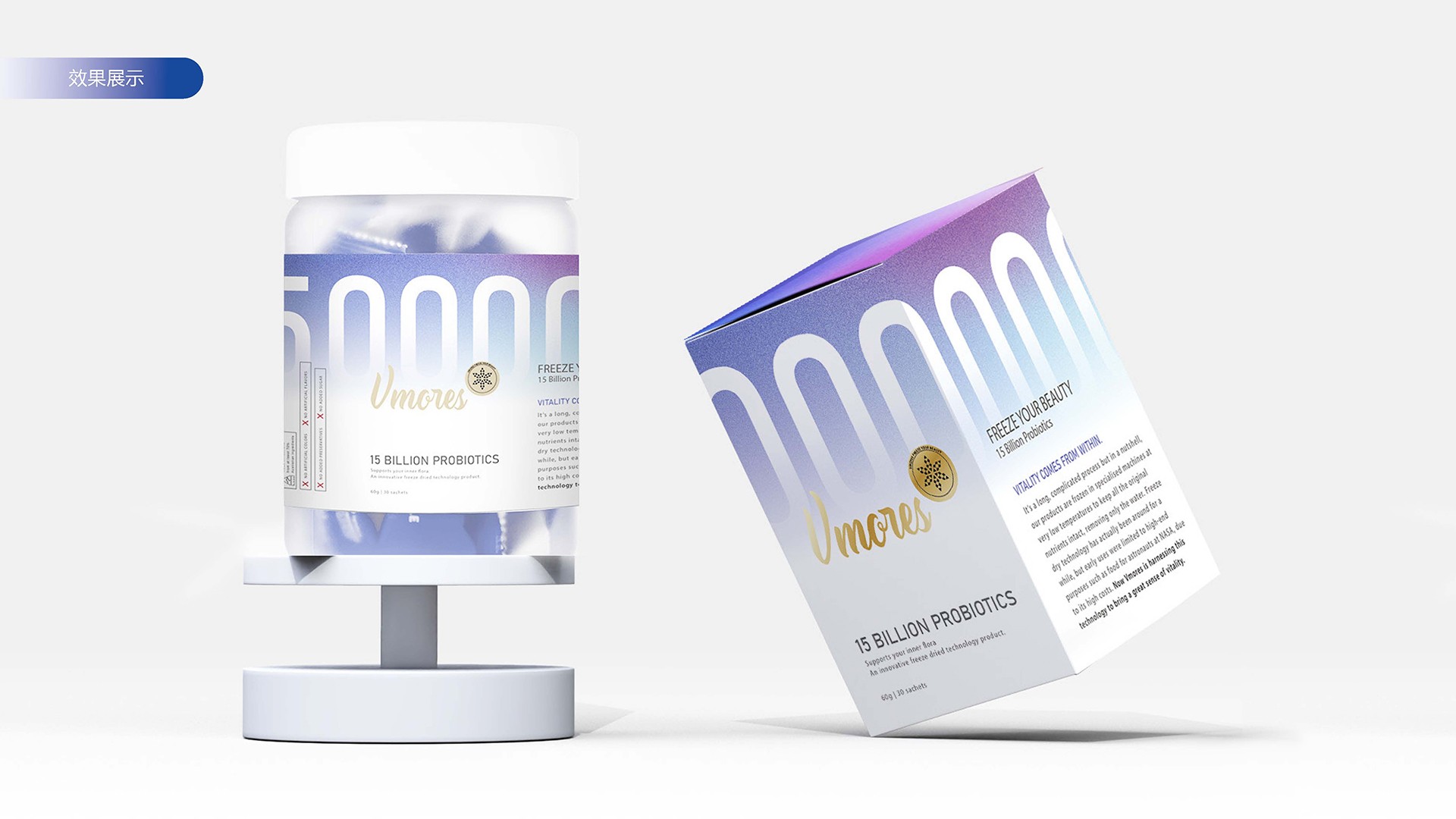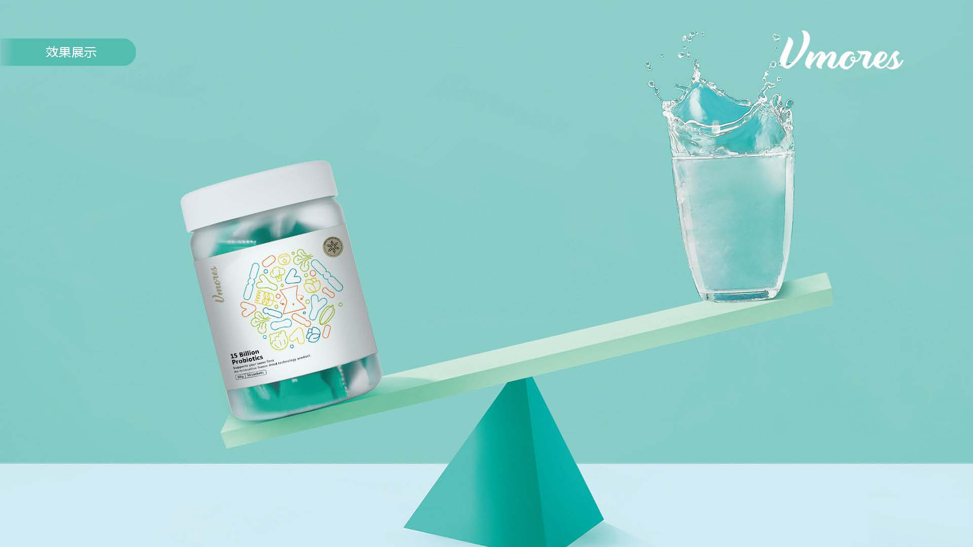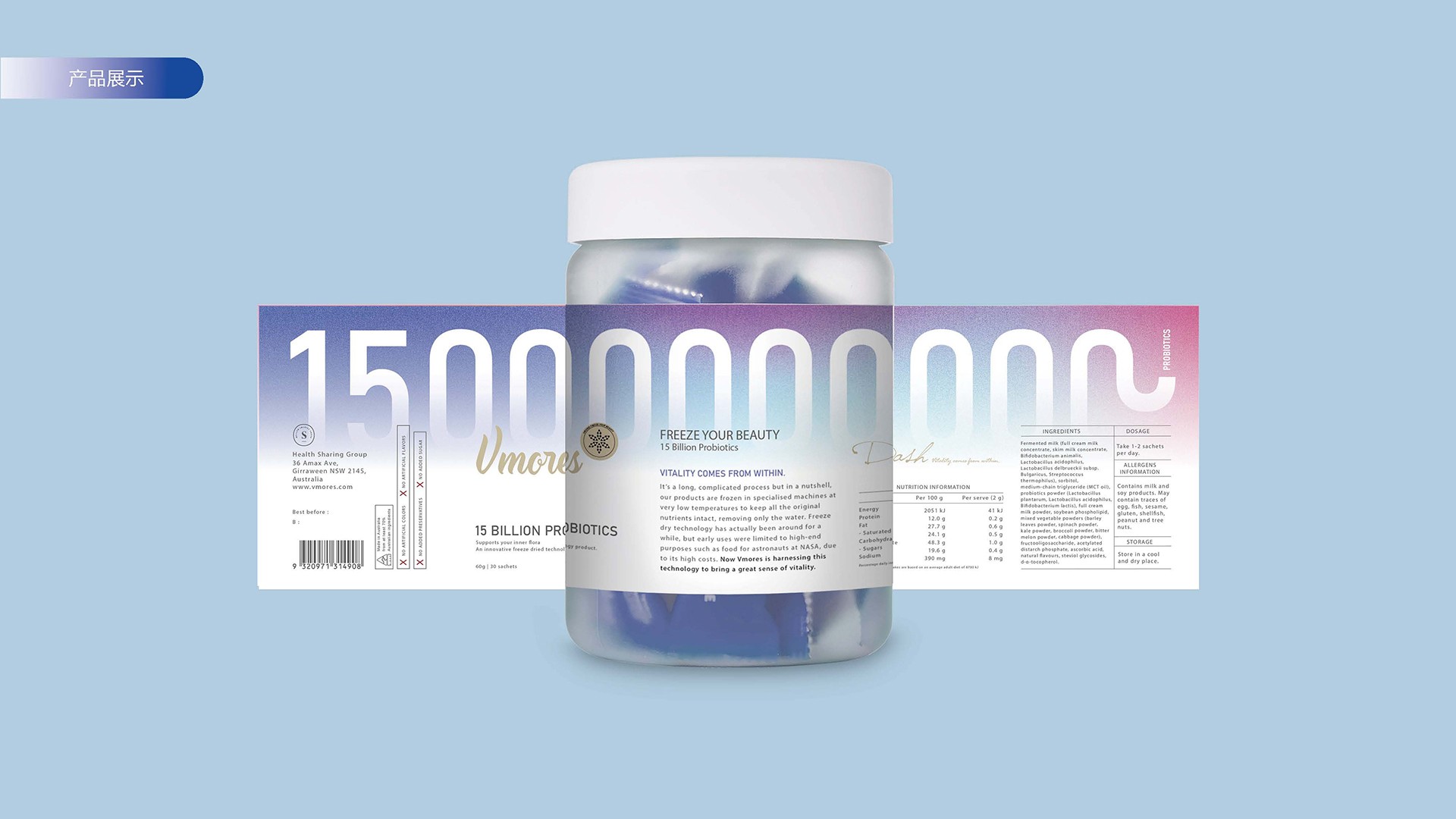突出150億益生菌,以大額數(shù)字吸引眼球;將數(shù)字設(shè)計(jì)成腸道形狀,表現(xiàn)“瘦子菌”是腸道中的有益菌群,產(chǎn)品有益與腸道的功效;整體使用多彩的漸變色,符合產(chǎn)品調(diào)性及目標(biāo)群眾的審美。此款包裝設(shè)計(jì)將產(chǎn)品效果和成分,以抽象的形式表現(xiàn)出來,插圖中心是瘦身效果,為產(chǎn)品功效,周圍是三種有益菌群,六種超級(jí)蔬菜的組合;說明產(chǎn)品營養(yǎng)健康,配色清新活波,較為年輕化。
