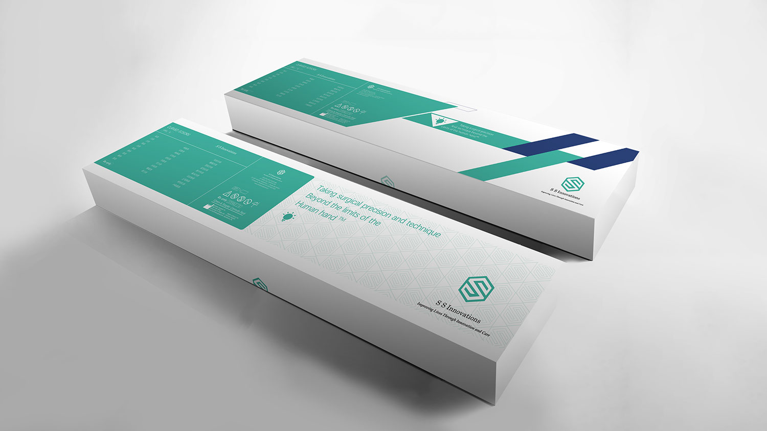 石特根據其品牌的產品特點及品牌理念,為其進行機器人醫療機械包裝設計。整體以品牌主色調藍綠色為主,白色做基調,利用品牌LOGO“S”的直角形狀與六邊形相結合,描繪輪廓,可形成大面積的淺色底紋,加強品牌視覺效果,體現技術嚴謹且有序;六邊形組成間的三角形看似平平無奇,眾所周知三角形是最穩固的形狀,體現制造技術安全穩定,整體簡約而不簡單。