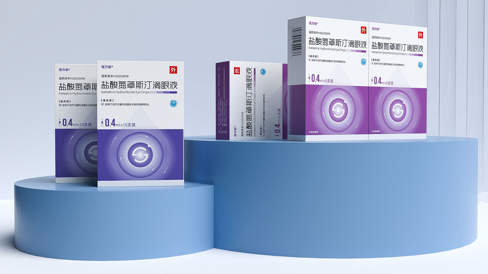 本項目是石特大健康為浙江視方極醫藥科技有限公司的核心產品——鹽酸氮?斯汀滴眼液,所提供的從終端包裝到專業DA(Detail Aid) 的一站式整合設計服務。該產品用于治療過敏性結膜炎,其市場成功既依賴于在藥店貨架上對消費者的直接吸引力,也離不開面向眼科醫生的專業學術推廣。我們的挑戰在于,如何構建一個統一的品牌視覺體系,使其在包裝上能清晰傳遞產品功效、激發購買欲望,同時在DA上能專業地呈現藥物機理和臨床優勢,成為醫生可信賴的處方依據,最終實現“藥店動銷”與“臨床推廣”的雙輪驅動。