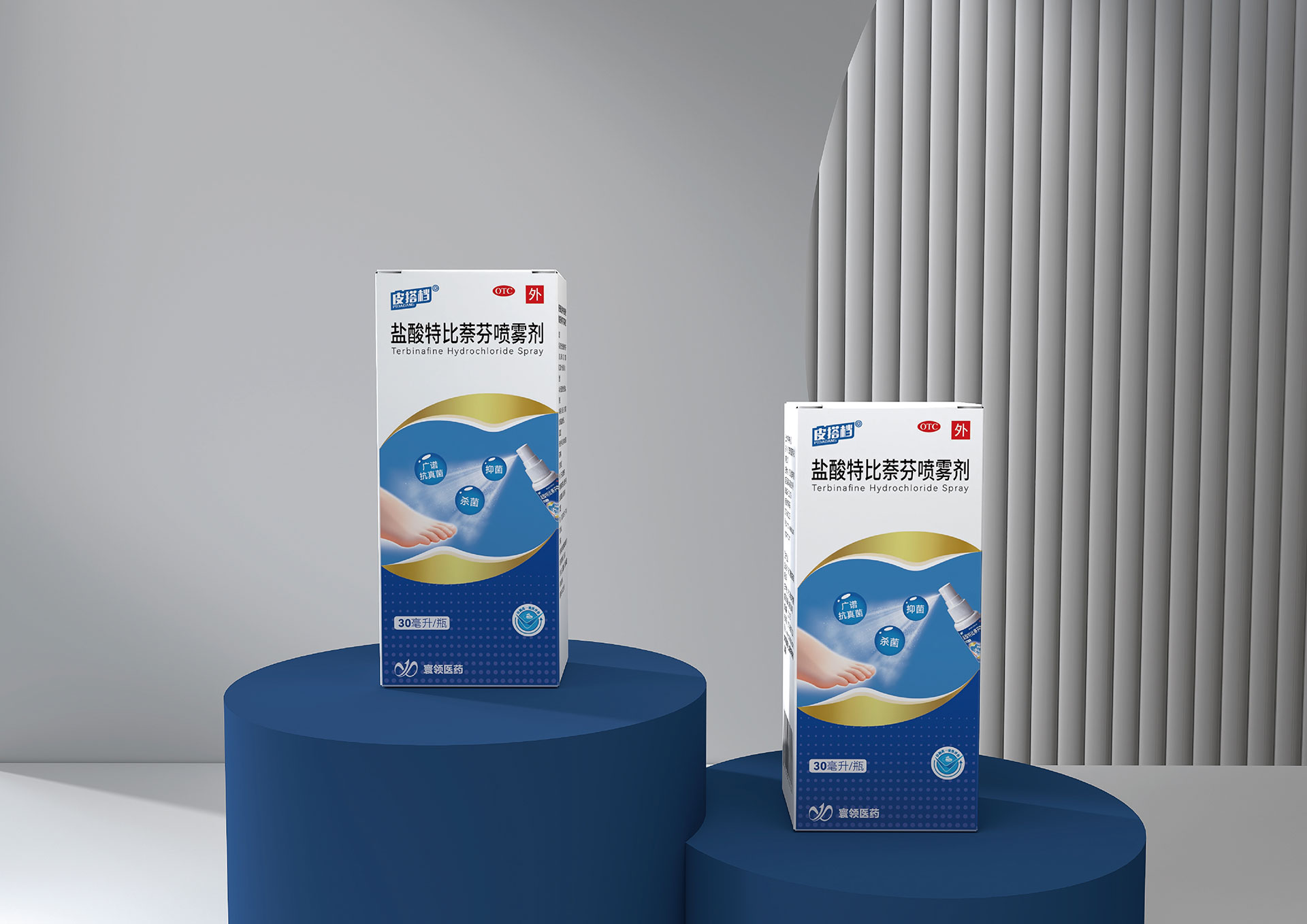 鹽酸特比萘芬噴霧劑系列:以活力橙為主識別色,象征抗真菌的強效與活力。