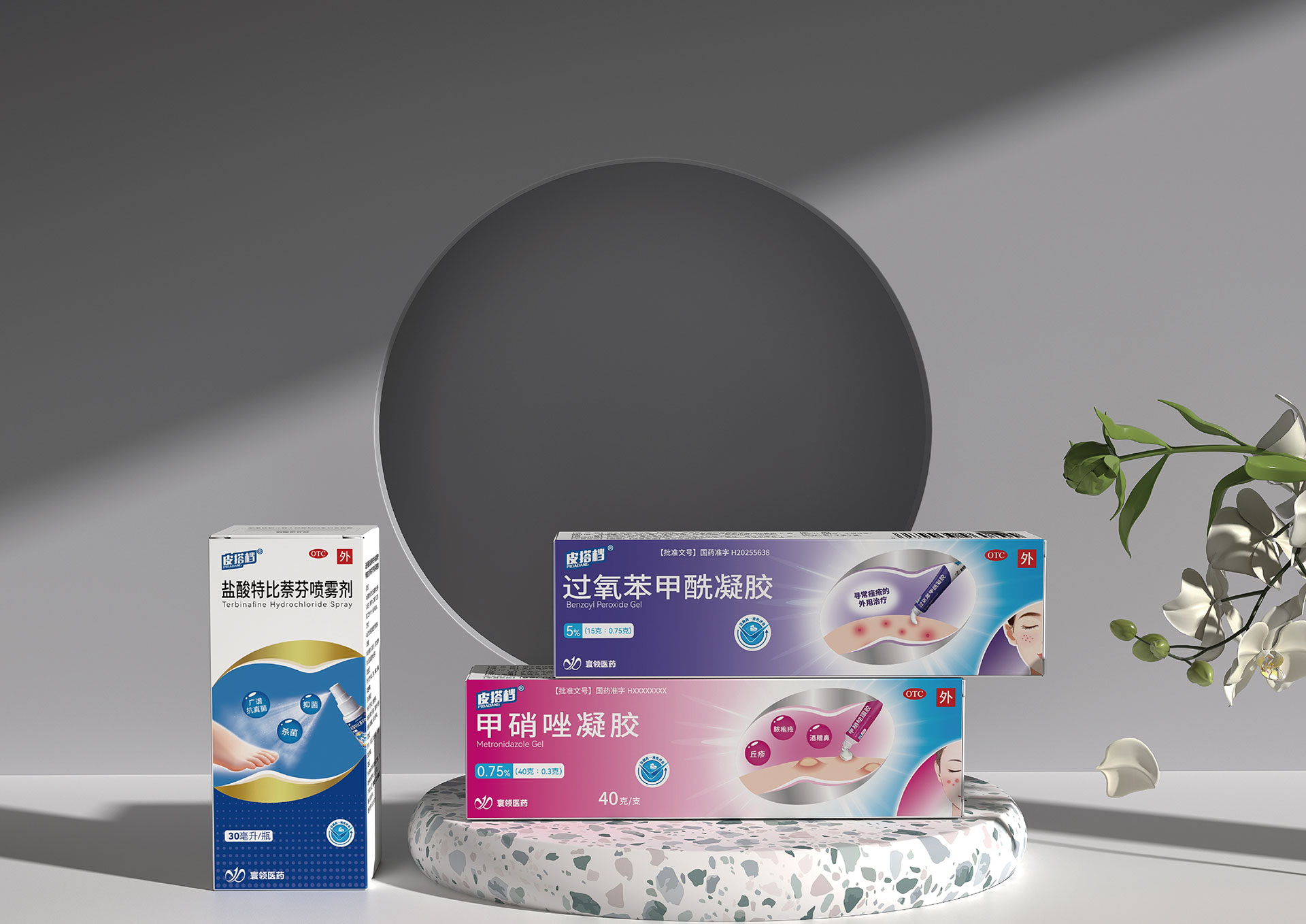 功能差異化與統(tǒng)一性的矛盾:甲硝唑凝膠(祛痘/抗炎)、鹽酸特比萘芬噴霧劑(抗真菌)、過氧苯甲酰凝膠(祛痘/殺菌)分屬不同治療領域,包裝需在統(tǒng)一家族感下,清晰傳遞各自的功能差異。